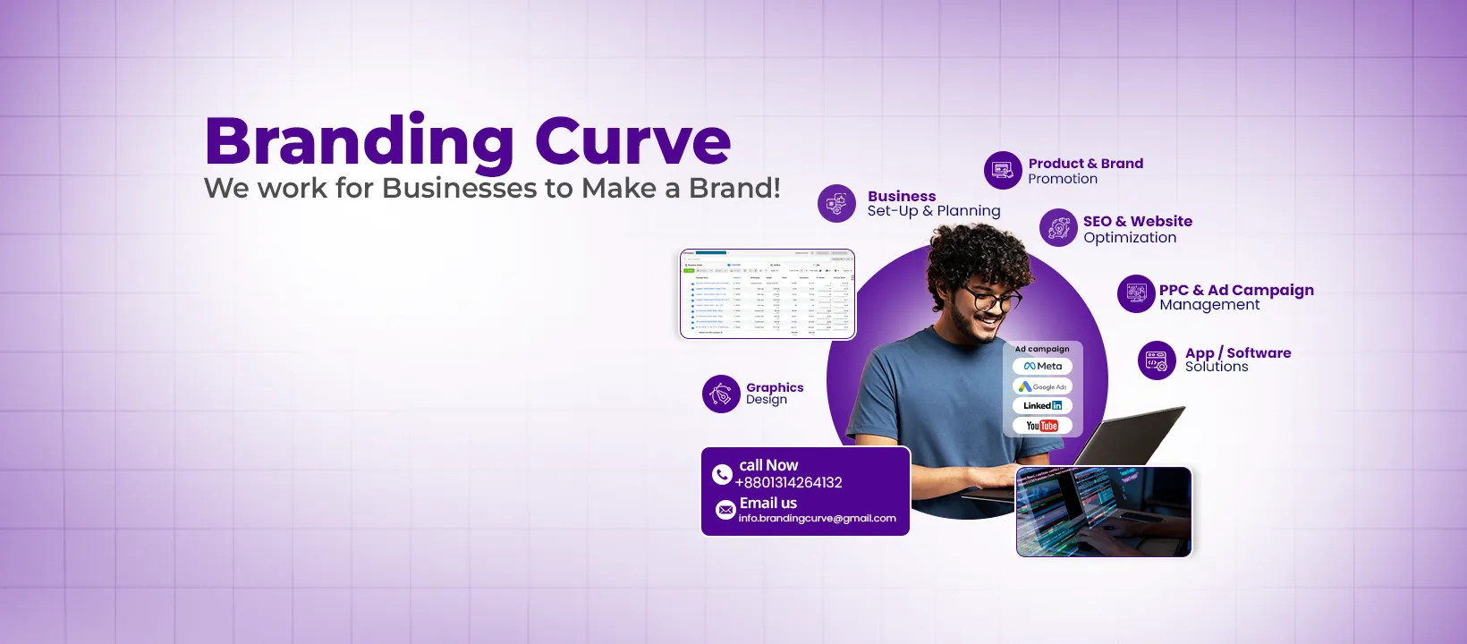 আপনার ব্যবসার সেলস, ব্র্যান্ড ভ্যালু, এবং ডিজিটাল উপস্থিতিকে এক নতুন উচ্চতায় নিয়ে যেতে Branding Curve কাজ করে স্ট্র্যাটেজিক মার্কেটিং, সৃজনশীল কন্টেন্ট, এবং কনভার্সন-ড্রিভেন ওয়েব এক্সপেরিয়েন্সের মাধ্যমে।